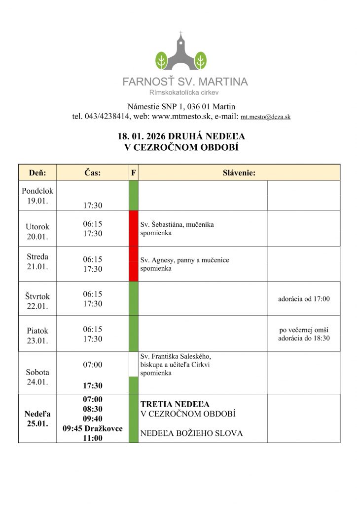 - Pozývame vás na farskú púť do Čenstochovej, ktorá sa uskutoční v sobotu 09.05. 2026. Do konca januára sa môžete prihlásiť na fare a zaplatiť zálohu 20 eur. Celková cena je 40 eur., pre deti do 18 rokov 20 eur.