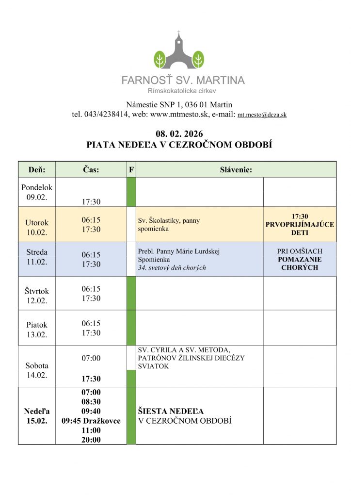 - Spoveď: pondelok – sobota o 17:00.