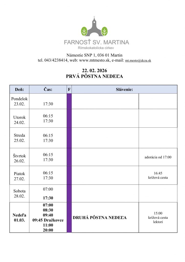 - Krížová cesta bude v piatok o 16:45 a v nedeľu o 15:00, budú sa ju modliť lektori.