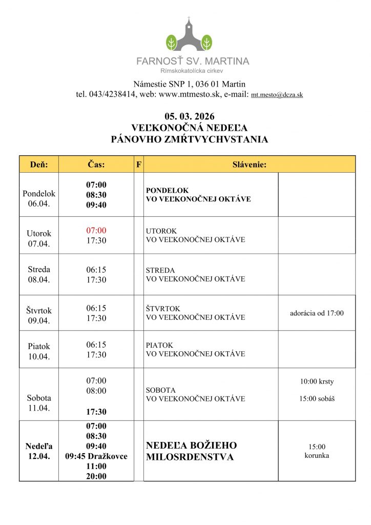 - Úradné záležitosti si môžete vybaviť tento týždeň od stredy do piatku po rannej a večernej omši, alebo podľa dohody cez telefón alebo e-mail.