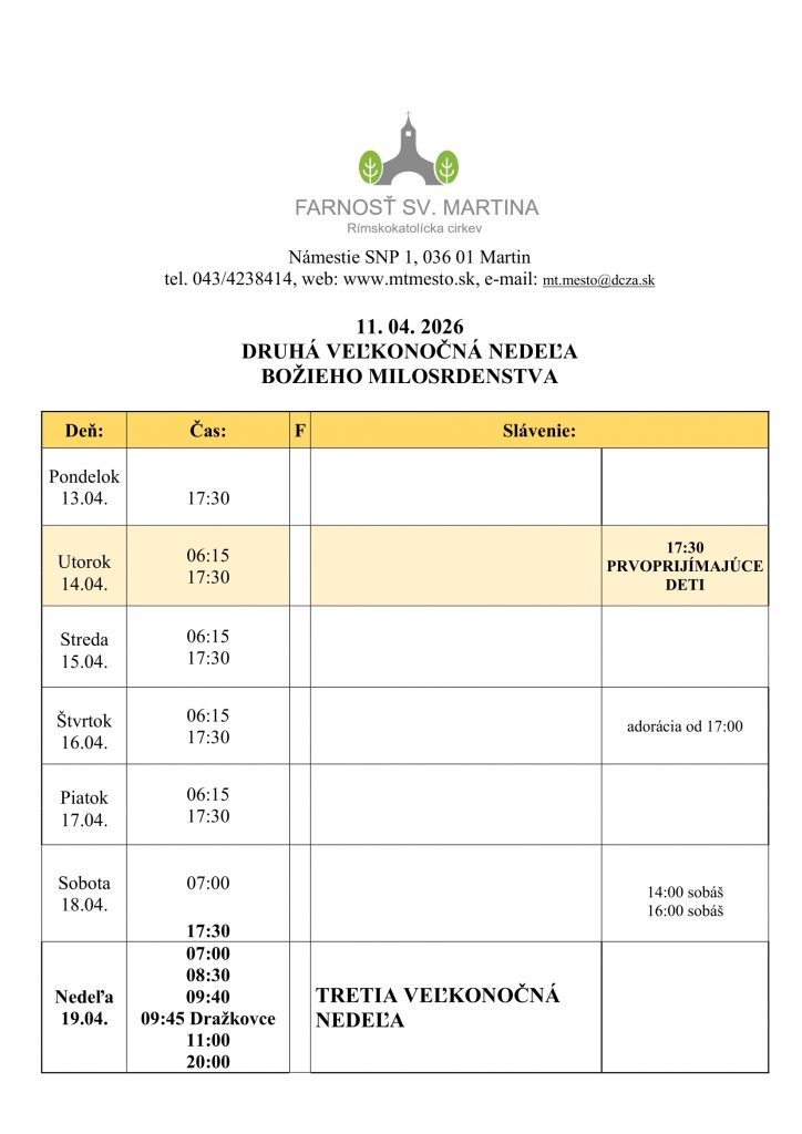 - Úradné záležitosti si môžete vybaviť tento týždeň od utorka do piatku po rannej a večernej omši, alebo podľa dohody cez telefón alebo e-mail. Počas úradných hodín si môžete prísť zapísať omše na mesiac máj.